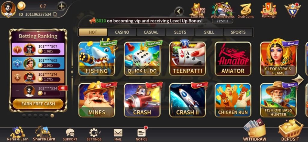 This online download game gives a referral windfall as a treasure for the players. You can share the game links with your family and friends using a social interaction platform. The more your referral deposits money, the more you will get the pluses. Referral is an easy way to earn without playing any games.