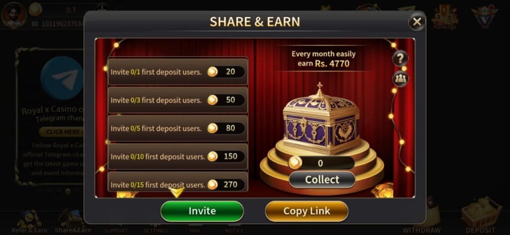 Moreover, Royal X casino – Real Money App provides a variety of games to its users. means that under one roof, you will find different games with different interfaces. The offered apps include Rummy, poker, Dragon vs Tiger, Teen Patti, Ludo, and many more. Also includes both card games and casino-style games. Players can earn real cash and generate a good income. Besides, don’t worry about how to make real money through playing online games? The answer is: welcome and midnight bonus, Daily login rewards, weekly and monthly challenge prizes, level-up bonuses, and special events.